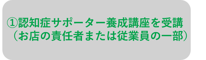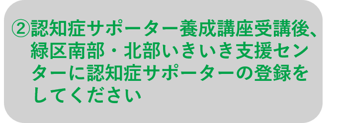 ①-1 認知症サポーター養成講座の開催日程等については、いきいき支援センターにお問合せください。 ①-2 すでに認知症サポーター養成講座を受講された方がいる場合は、いきいき支援センターにご連絡ください。 | |